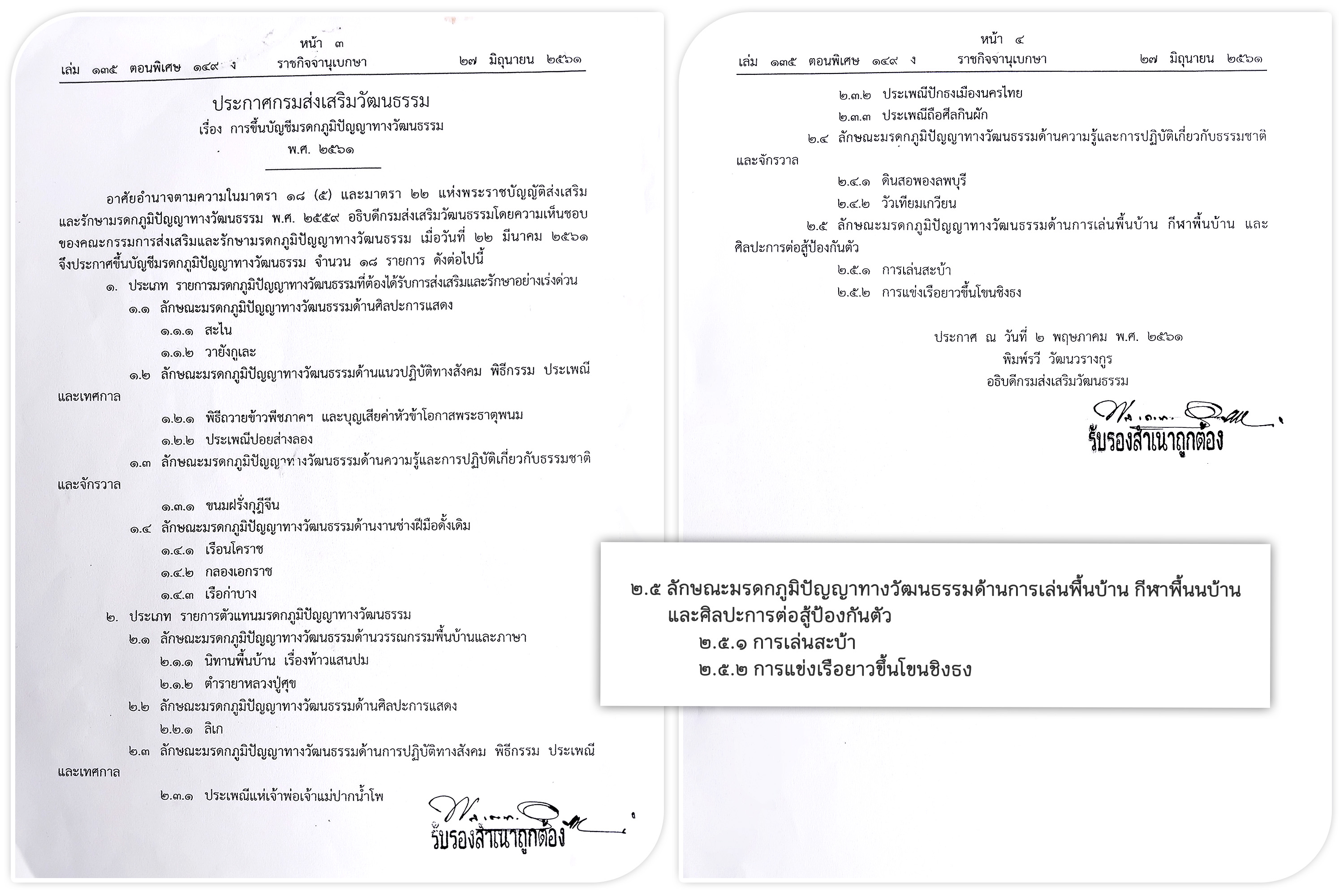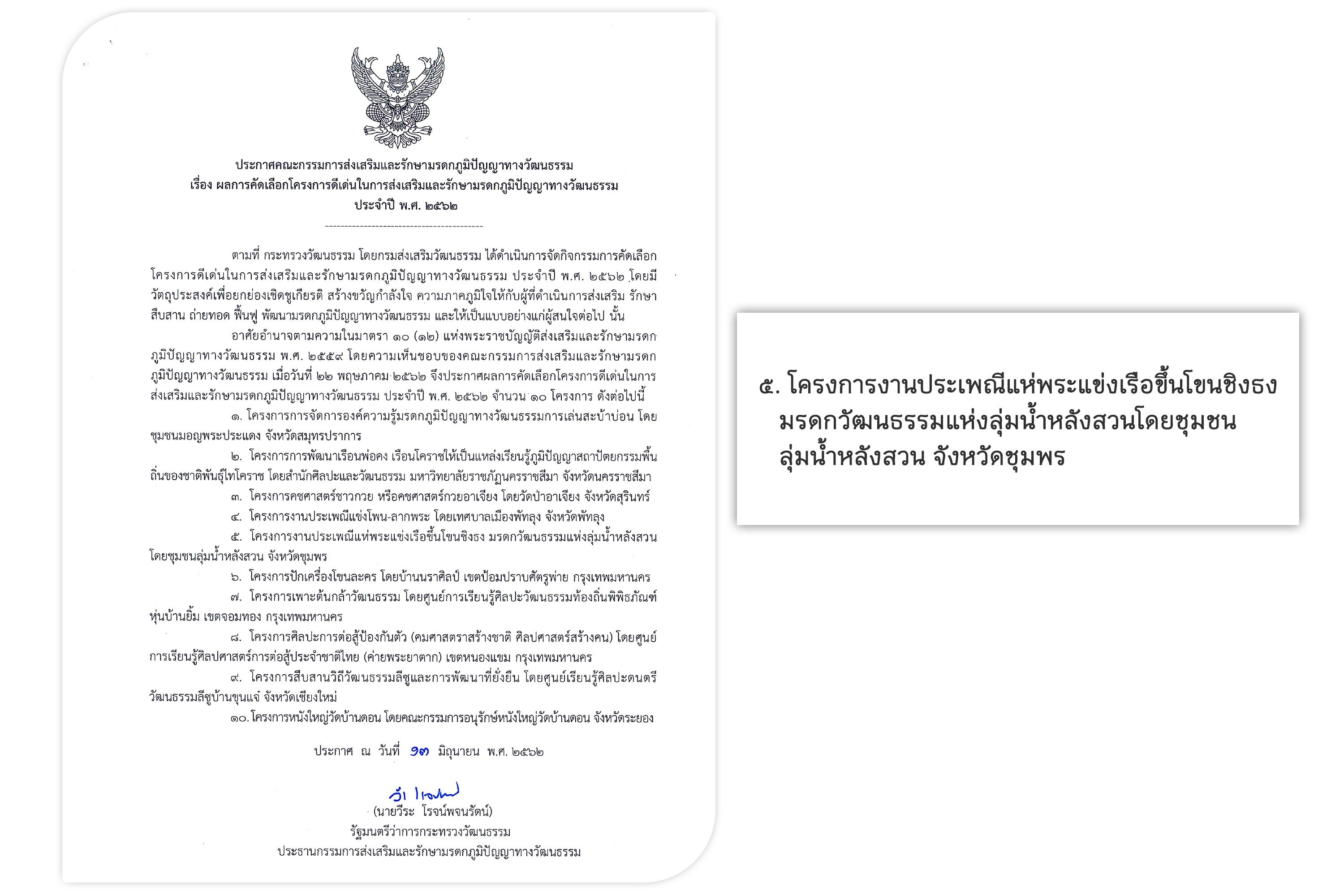 • “ขึ้นโขนชิงธง” มรดกภูมิปัญญาทางวัฒนธรรมของชาติ ปี ๒๕๖๑ กระทรวงวัฒนธรรม โดยกรมส่งเสริมวัฒนธรรม ได้ประกาศให้ “การแข่งเรือยาวขึ้นโขนชิงธง” ขึ้นบัญชีเป็นมรดกภูมิปัญญาทางวัฒนธรรมของชาติ ด้านการเล่นพื้นบ้าน กีฬาพื้นบ้าน และศิลปะการต่อสู้ป้องกันตัว เมื่อวันที่ ๒๒ มีนาคม ๒๕๖๑