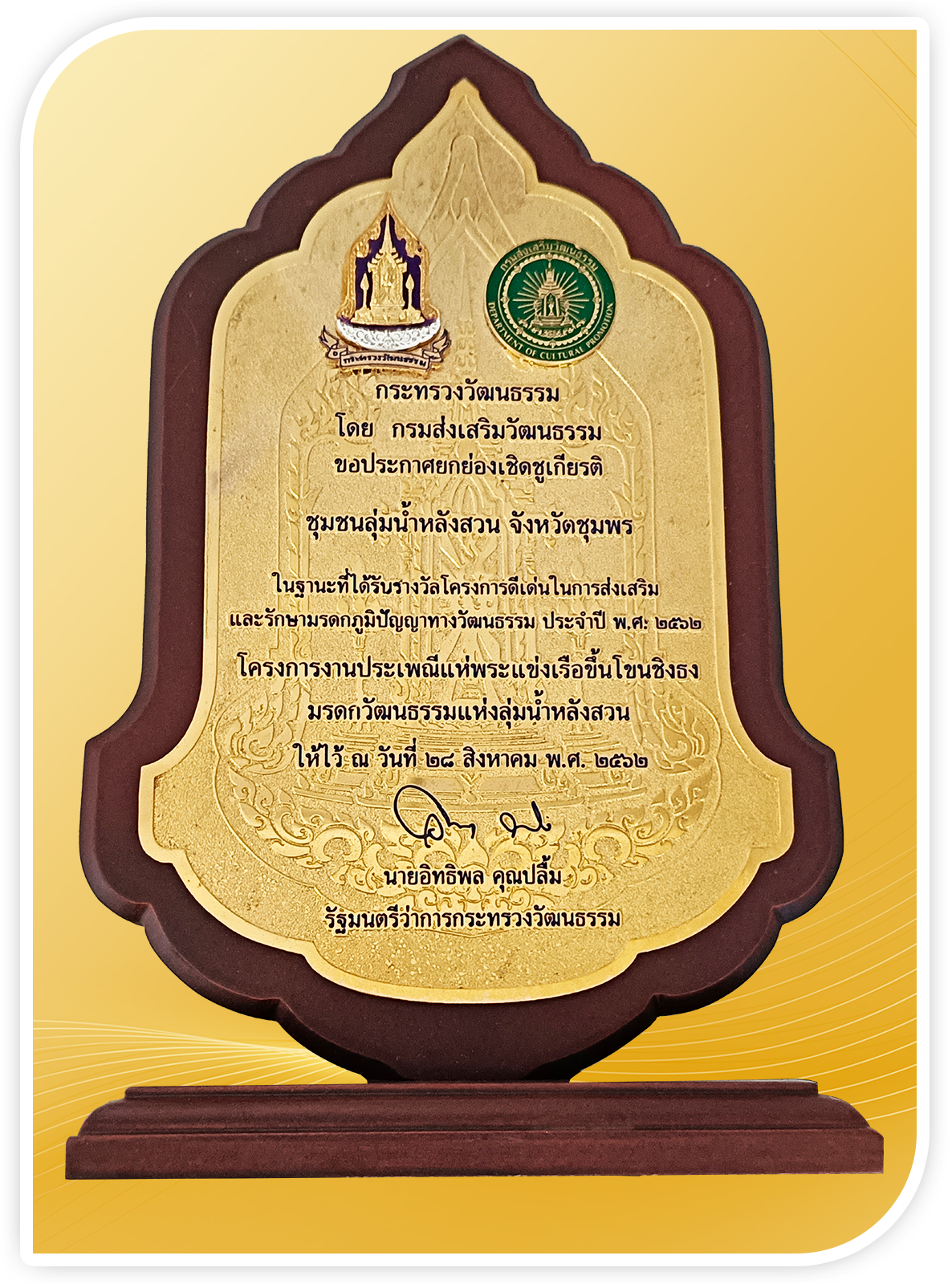 • “งานประเพณีแห่พระแข่งเรือขึ้นโขนชิงธงฯ ลุ่มน้ำหลังสวน” โครงการดีเด่นในการส่งเสริมและรักษาวัฒนธรรมประจำปี ๒๕๖๒ คณะกรรมการส่งเสริมและรักษามรดกภูมิปัญญาทางวัฒนธรรม กระทรวงวัฒนธรรม ได้คัดเลือกให้ “โครงการงานประเพณีแห่พระแข่งเรือขึ้นโขนชิงธง มรดกวัฒนธรรมลุ่มน้ำหลังสวน โดยชุมชนลุ่มน้ำหลังสวน จังหวัดชุมพร” เป็น ๑ ใน ๑๐ โครงการดีเด่นในการส่งเสริมและรักษามรดกภูมิปัญญาทางวัฒนธรรม ประจำปี พ.ศ. ๒๕๖๒