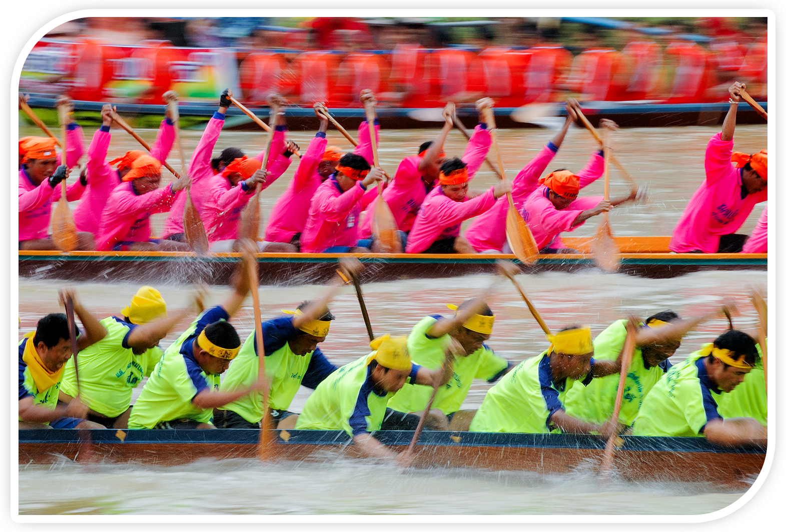 - ๔. การพาย โน้มตัวไปข้างหน้าให้สุด ใบพายลงน้ำในตำแหน่งที่นั่งกระทง เรือข้างหน้าถึงพายสุดแรง ใบพายถึงสะโพก